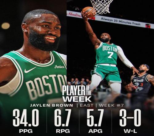 杰倫-布朗在上周共出戰(zhàn)3場比賽,場均能夠得到34分6.7個籃板5.7次助攻。在布朗參加的3場比賽當(dāng)中,凱爾特人保持了全勝戰(zhàn)績,目前球隊的連勝已經(jīng)來到了5場。