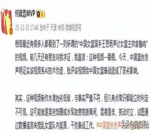 媒體人付政浩發(fā)文點評說道“這種視頻制作水準拙劣低級,與事實嚴重不符,但凡有點常識都能立時判定不可信。這可能就是某些飯圈或水軍故意挑撥離間、混淆是非、挑動對立,試圖通過散播謠言來攪亂女籃隊內(nèi)氛圍,干擾備戰(zhàn)工作?!?/p>