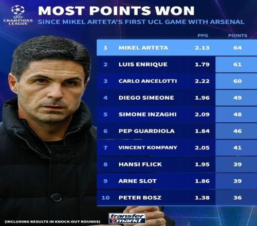 德轉(zhuǎn)也盤點(diǎn)了自阿爾特塔執(zhí)教阿森納歐冠首秀以來,各位主帥在歐冠同期積分榜(包括淘汰賽),在跟諸多名帥對比時阿爾特塔絲毫不吃虧,列第一。他場均2.13分、總分64分分別排名第二、第一,不管是哪個層次來看都是在名帥級別的。